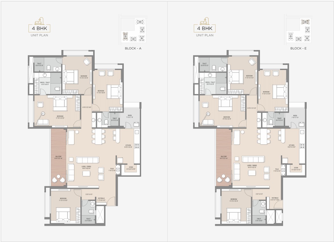 Size: 2640 Sq Ft – 3 BHK & 3445 Sq Ft – 4 BHK Super Build up area